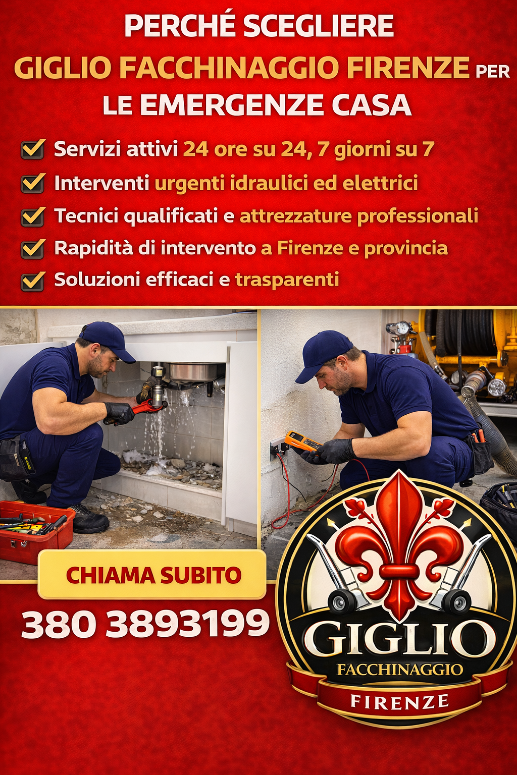 Giglio Facchinaggio Firenze offre Servizi Casa H24 per emergenze domestiche, con interventi rapidi e professionali disponibili 24 ore su 24, 7 giorni su 7, inclusi i giorni festivi.